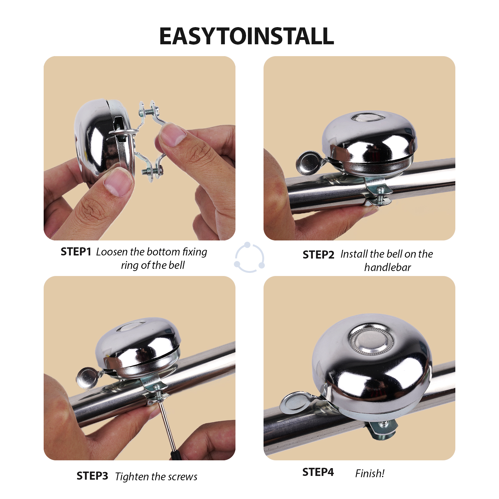 – This silver metal bicycle bell delivers a loud, clear ring, ensuring you’re heard by pedestrians and fellow cyclists.