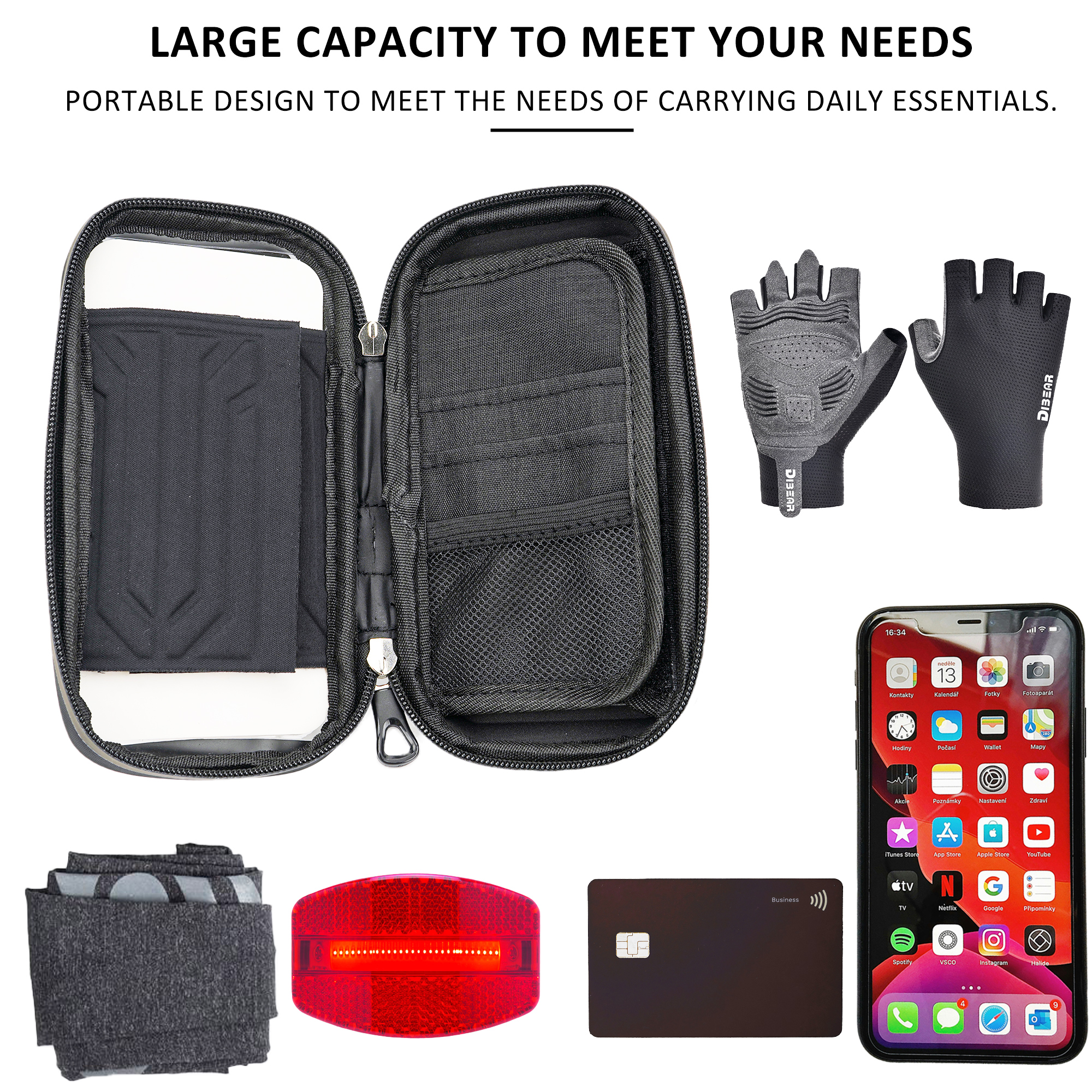 Spacious interior holds keys, wallet, mini tools, and more — not just a phone mount.